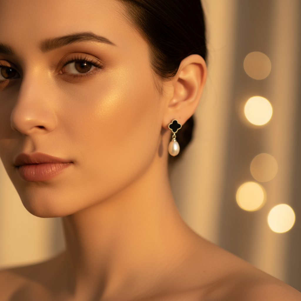 The perfect drop pearl earrings dazzle with black colour and brilliance. Sparkling black agate gemstone separating the pearl from a bed of color_saturated gemstone. The movement of pearl emphasises its beauty and elegance setting on the sterling silver