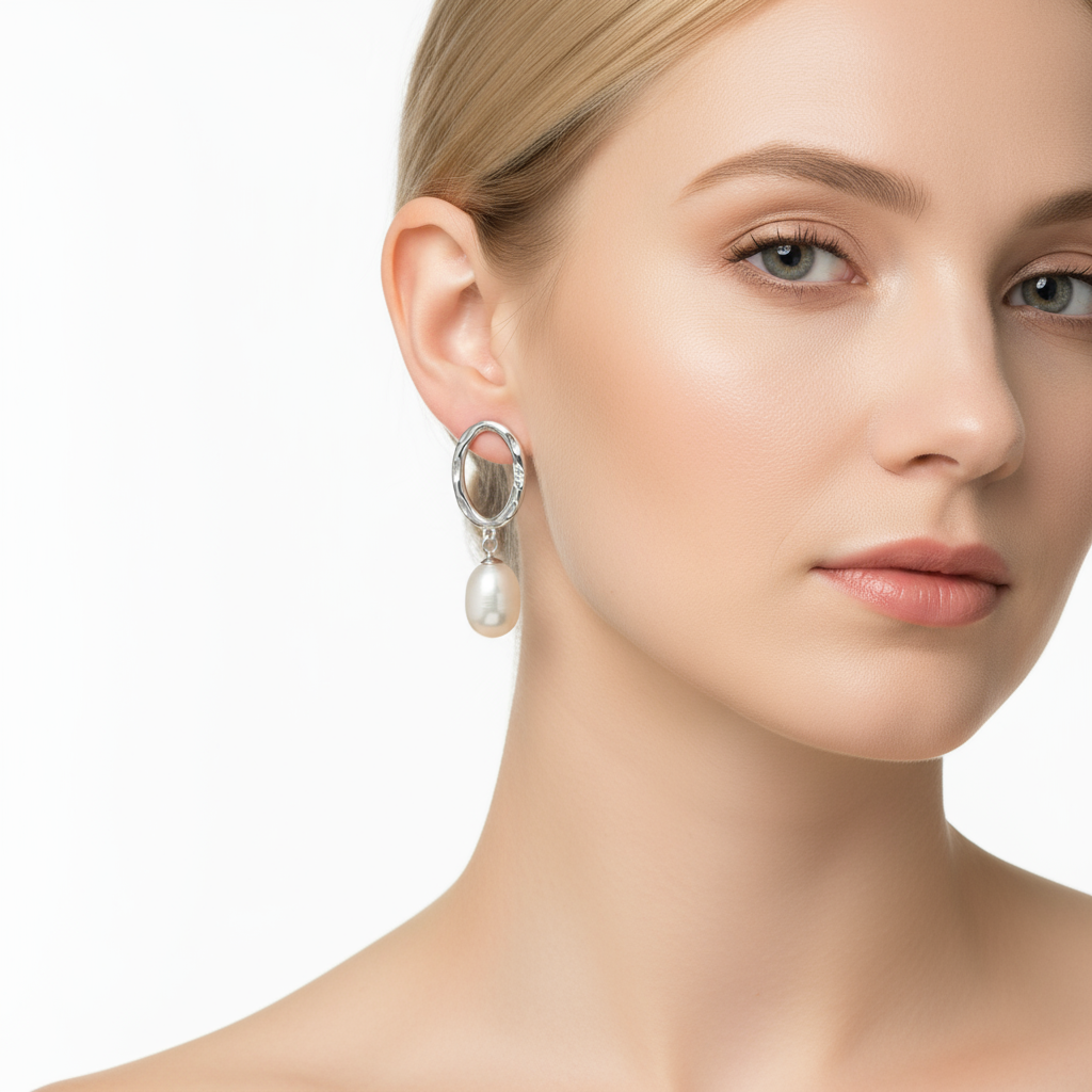 We combined a drop freshwater pearl with a hammered sterling silver hoop for a look that’s a little bit prep, a little bit art school. Pearl diameter 9-9.5mm. White cultured freshwater pearls.