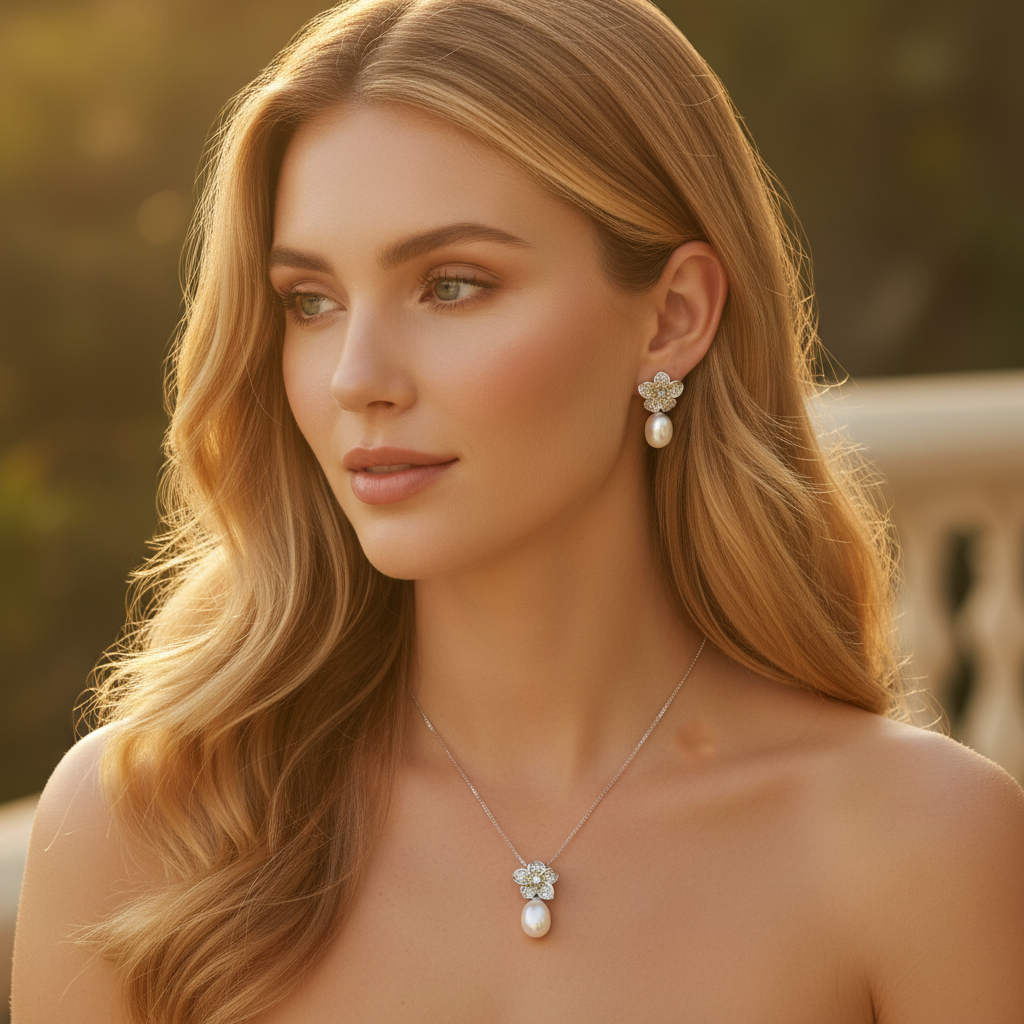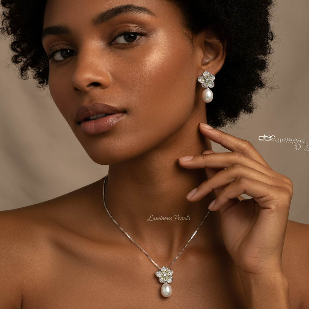The perfect Large drop pearl set dazzle with flower shape and brilliance. Sparkling cubic zirconia crystal separating the pearl from a bed of color, The slight movement of pearl emphasises its beauty and elegance setting on the sterling silver,