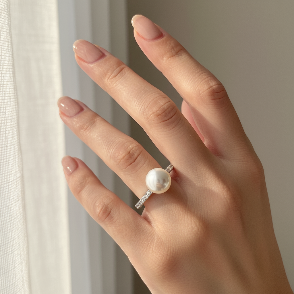 The perfect freshwater pearl ring for any occasion.  It is glamorous Ring with high luster perfect round pearl setting on sterling silver. This piece is delightful  and one that will admired by all.
